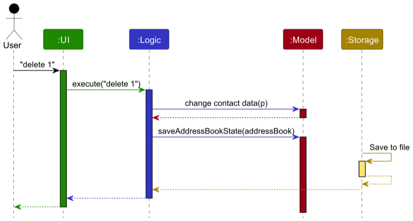 The Sequence Diagram below shows how the components interact with each other for the scenario where the user issues the command delete 1.